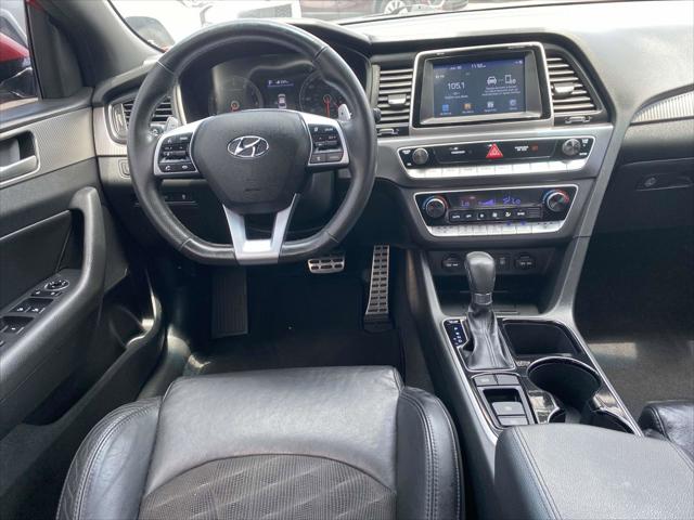 Look at this 2019 Hyundai Sonata Sport. Its Automatic transmission and Regular Unleaded I-4 2.4 L/144 engine will keep you going. This Hyundai Sonata features the following options: SCARLET RED FIRST AID KIT CARPETED FLOOR MATS BLACK LEATHER BOLSTER/CLOTH INSERT SEATING SURFACES -inc: sport bolsters Wheels: 17 x 7.0J Aluminum Alloy Wheels w/Silver Accents Valet Function Trunk Rear Cargo Access Trip Computer and Transmission w/Driver Selectable Mode and Oil Cooler. Stop by and visit us...